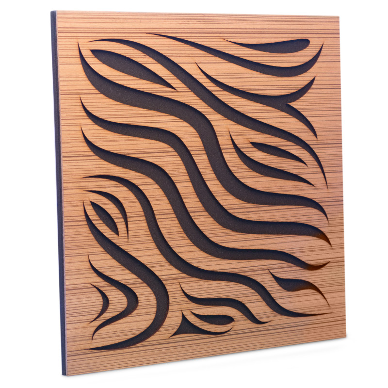 Excellent functional acoustic panel Ecosound Chimera Zebrano, ideal for improving the acoustics of a large and small area. The panel eliminates extraneous sounds, absorbs echo and noise, improves speech intelligibility. Acoustic foam rubber, allows you to achieve the perfect sound, improves the sound of musical instruments and vocals. Produced from natural wood, MDF and acoustic polyurethane foam, safe and hypoallergenic in its qualities. The sound absorption coefficient is 0.69. This model is made in cream color and measures 50 cm x 50 cm, with a thickness of 5.3 cm. The panel has a veneered finish. The panel is placed on the walls and ceiling.